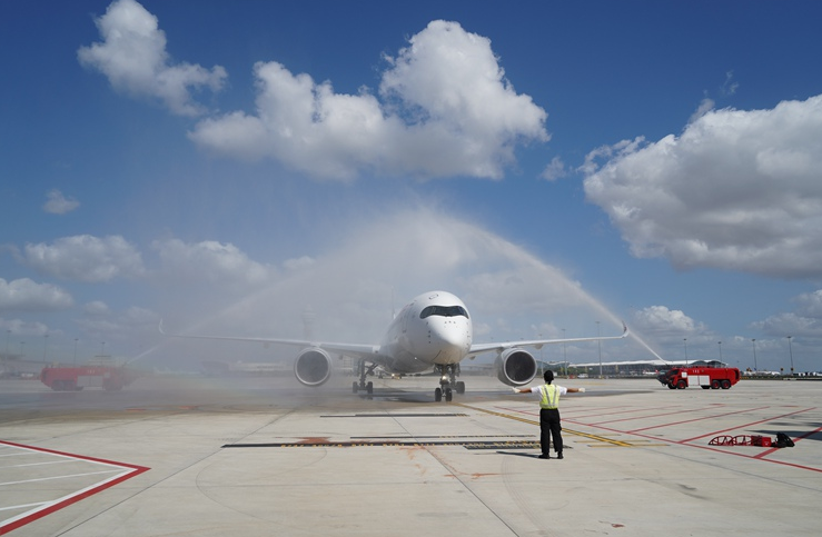 9月16日,,,,,,位于浦东机场T1、T2两座航站楼南侧的天下最大单体卫星厅正式投运。。 。。。在启用仪式现场,,,,,,东上航一架A350飞机与一架B787飞机从远处徐徐滑来,,,,,,浦东机场以盛大的“水门欢迎